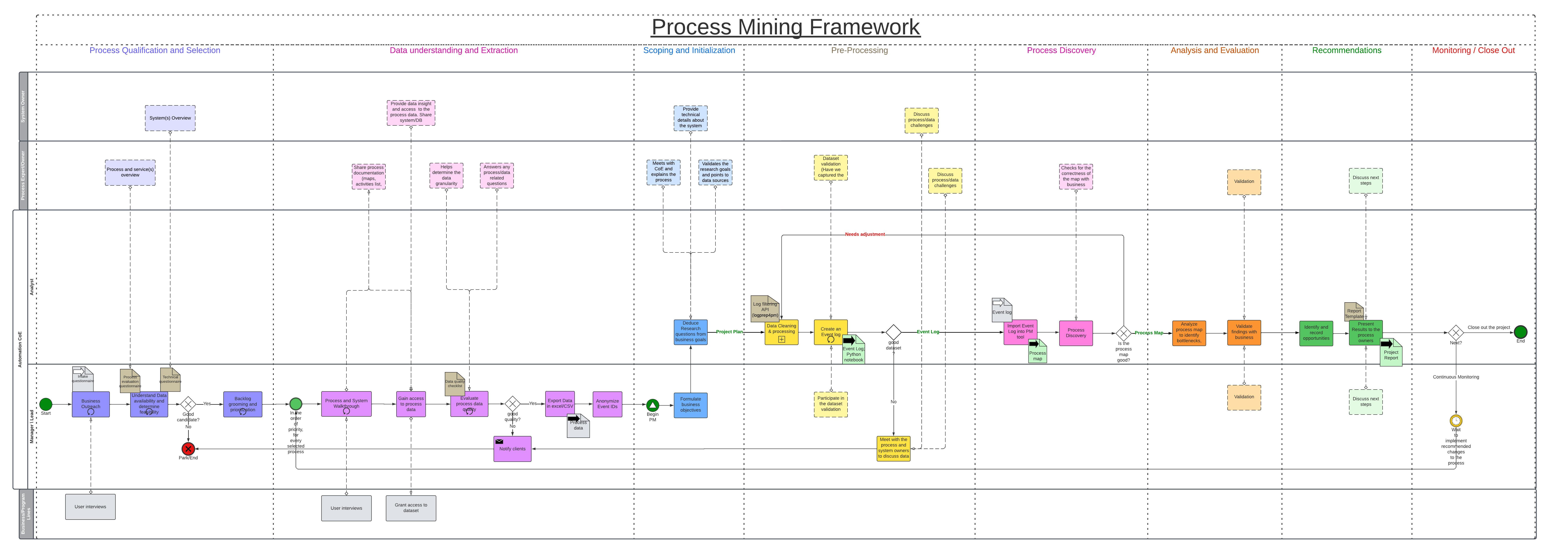 In Process Mining projects, data acquisition and preprocessing activities can easily comprise 60% of the project lifecycle. Negotiating access to data can be challenging as business/process owners often don’t understand process mining and are reluctant to share what it may reveal about their process(es). Accordingly, we’ve focused our framework on the initial process qualification, data wrangling, and efforts required to convince key stakeholders to try process mining. Our framework aims to ensure that the process mining projects you pursue are qualified and will deliver return on investment.